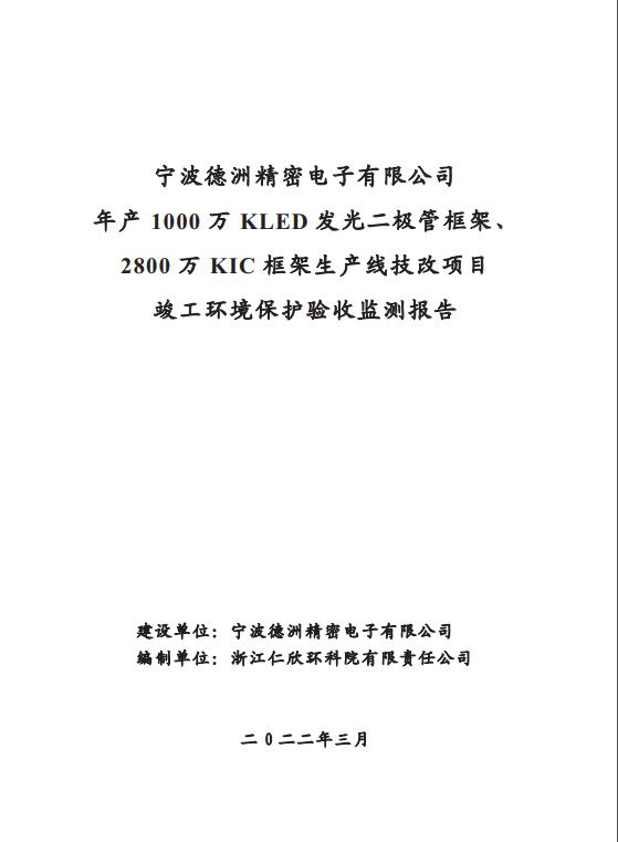 寧波德洲精密電子有限公司年產1000萬KLED發光二極管框架、2800萬KIC框架生產線技改項目竣工環...